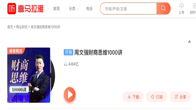 在喜马拉雅平台上,他的公益课《周文强财商思维1000讲》播放量长期位居商业财经榜前列;在抖音、快手等平台,他的讲课视频传播量以亿为单位。不同于一般的“成功学鸡汤”,他的课并非只讲“梦想”“坚持”,而是拆解财富的底层逻辑——营销力、投资力、财务知识、法律意识,这四个能力被他称为“财商的四大支柱”。