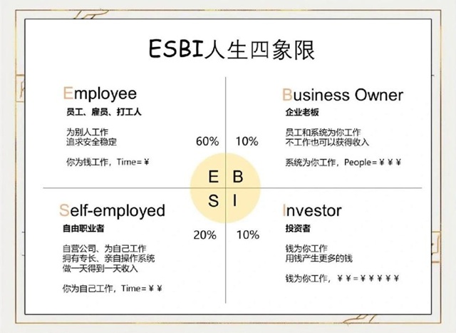 真正的成功学,是教你改变思维模型。周文强引入了《富爸爸穷爸爸》作者罗伯特·清崎的“ESBI”四象限理论,一针见血地指出:这世界上97%的人在左象限(E雇员、S自由职业者),为了钱工作;而真正自由的人在右象限(B企业家、I投资家),让系统和钱为自己工作。